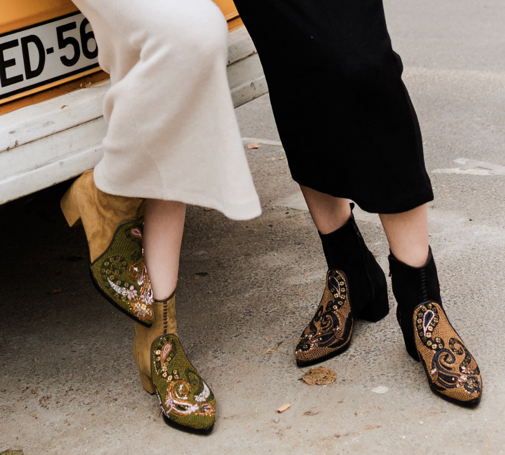 Ogni collezione viene concepita nel loro Atelier di Londra e Berlino, dove lavorano con tecnici specializzati in Europa. Questi disegni vengono poi trasformati in scarpe e accessori decorati: ogni scarpa è realizzata a mano da maestri artigiani che lavorano con le tomaie decorate per creare scarpe e borse uniche.